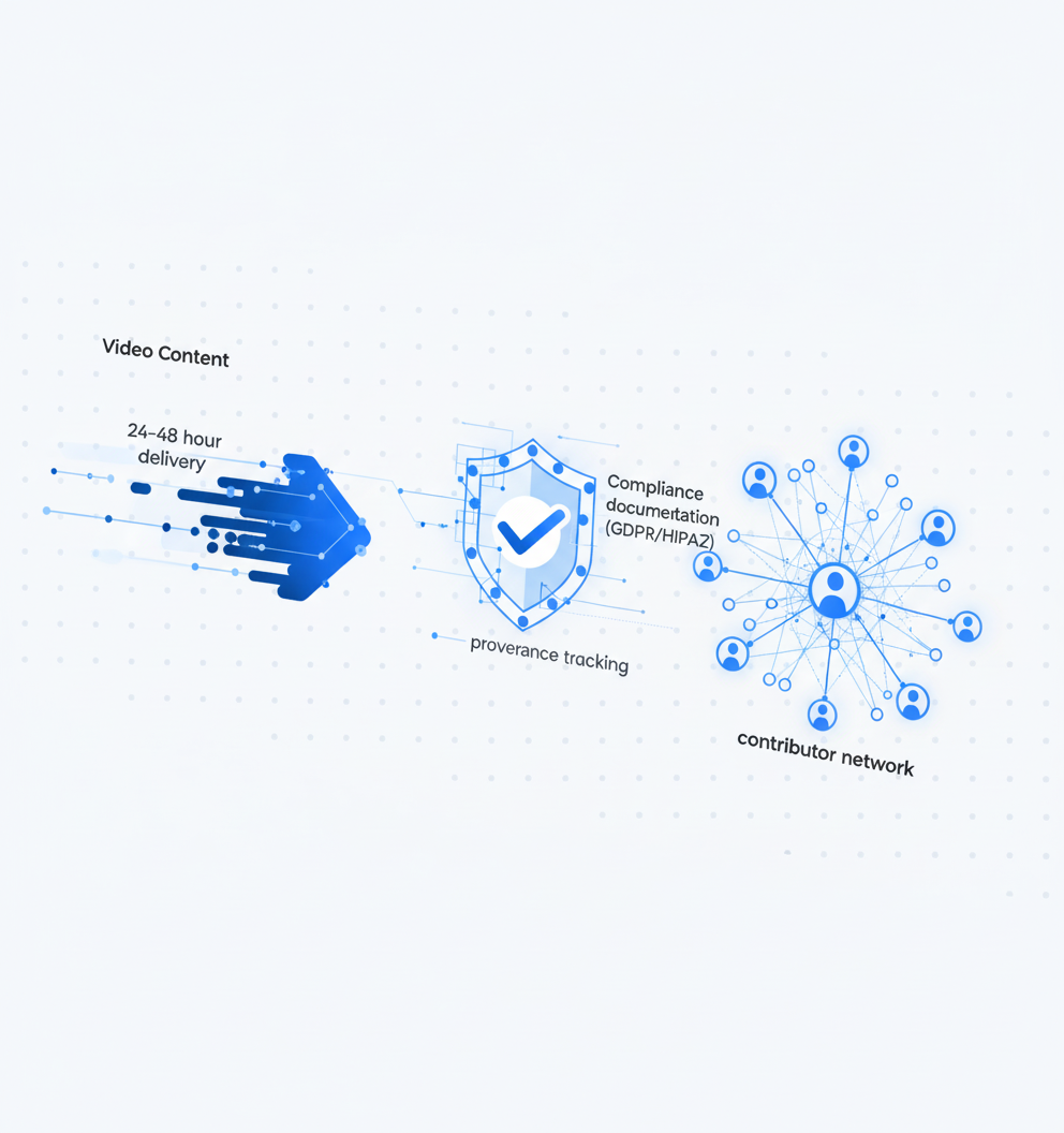 | Licensed media archives (Protege, Troveo, Versos) | Video-heavy model training | Days to weeks | Rights-cleared, biometric law compliant |